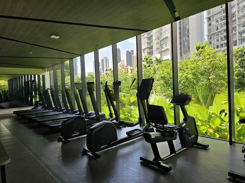 This spacious 5-bedroom unit boasts standout features such as a galley kitchen with wood-grain cabinets and integrated appliances, a dining room adorned with a designer chandelier, and a marble-clad bathroom equipped with a double vanity and rain shower. The infinity-edge pool and landscaped garden provide a serene outdoor retreat, while the communal gym offers modern cardio equipment with views of lush greenery.