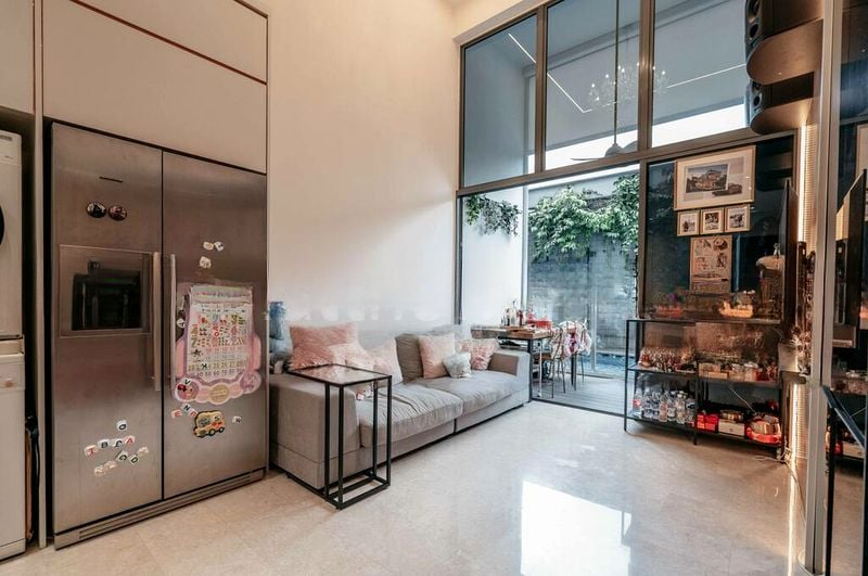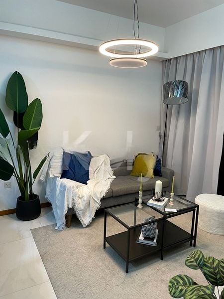 This unit boasts standout features including a stylish study nook, a luxurious bathroom with a rain shower, and a cozy living room adorned with contemporary pendant lighting and lush greenery. The bedroom offers a serene retreat, complete with striking wall art and a plush grey upholstered bed frame, ensuring comfort and style.