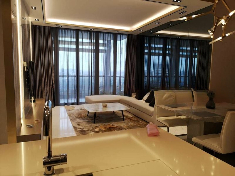 Step into a world of modern luxury as you enter this beautifully designed unit at South Beach Residences. Bathed in abundant natural light, the open-concept living area features a striking backlit marble feature wall and floor-to-ceiling windows that frame breathtaking city skyline views. The ambiance is elevated by a designer branch chandelier, complemented by elegant marble flooring and a stylish patterned area rug.