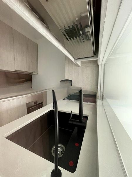 This well-maintained unit features a thoughtfully designed layout that maximizes space and comfort. The living room seamlessly connects to the balcony, while the bedroom boasts light wood flooring and direct access to the same stunning views. The galley kitchen is equipped with integrated appliances and elegant wood-grain cabinetry, complemented by stone countertops. The bathroom is a luxurious retreat, featuring a walk-in shower with a rain shower head and a floating vanity.