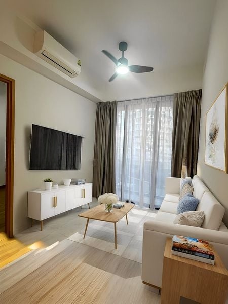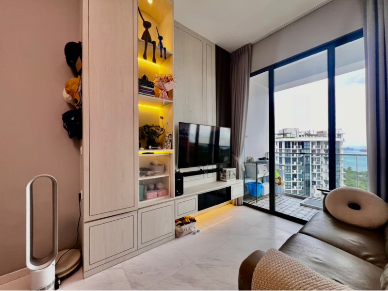 Step into a bright and airy sanctuary where abundant natural light floods through floor-to-ceiling windows, offering breathtaking views of the sea and lush greenery. The polished tile flooring and fluted TV feature wall create an inviting ambiance, perfect for relaxation or entertaining. Sliding glass doors lead to a private balcony, where you can unwind while gazing at the serene landscape.