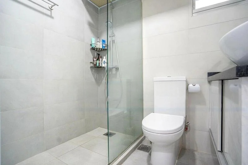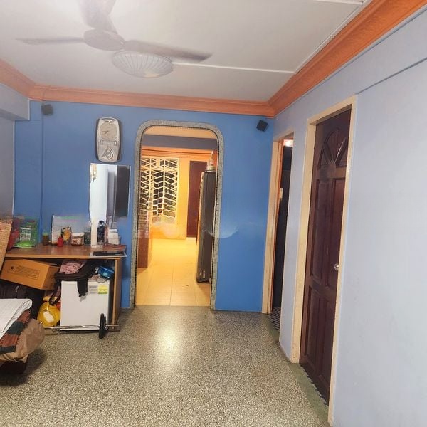 Step into this inviting 2-bedroom flat and be greeted by the timeless charm of classic terrazzo flooring underfoot, complemented by an arched doorway that adds character to the living space. The blue accent walls create a unique ambiance, while the functional layout ensures a cozy atmosphere, perfect for relaxation. Although natural light is limited, the greenery views from the windows provide a refreshing touch of nature amidst the urban setting.