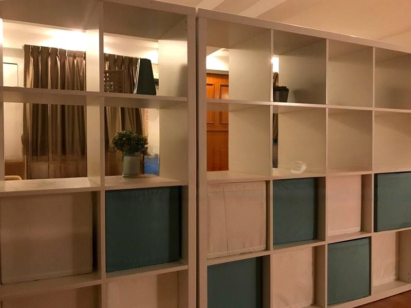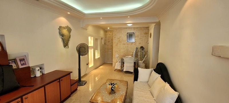 This unit features a practical layout with built-in wooden wardrobes in the bedrooms, a functional kitchen equipped with wooden cabinets and a gas stove, and a separate utility area for added convenience. The living room boasts an open layout with white tiled flooring, providing a blank canvas for your personal touch. The bathroom is fitted with tiled walls and a pedestal sink, ensuring a clean and tidy space.