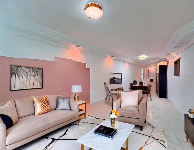 Step into a warm and inviting atmosphere where a striking pink accent wall greets you in the living room, complemented by cove lighting that enhances the cozy ambiance. The open-concept layout seamlessly connects the dining area, creating a perfect space for family gatherings, while moderate natural light fills the room, making it feel bright and welcoming.