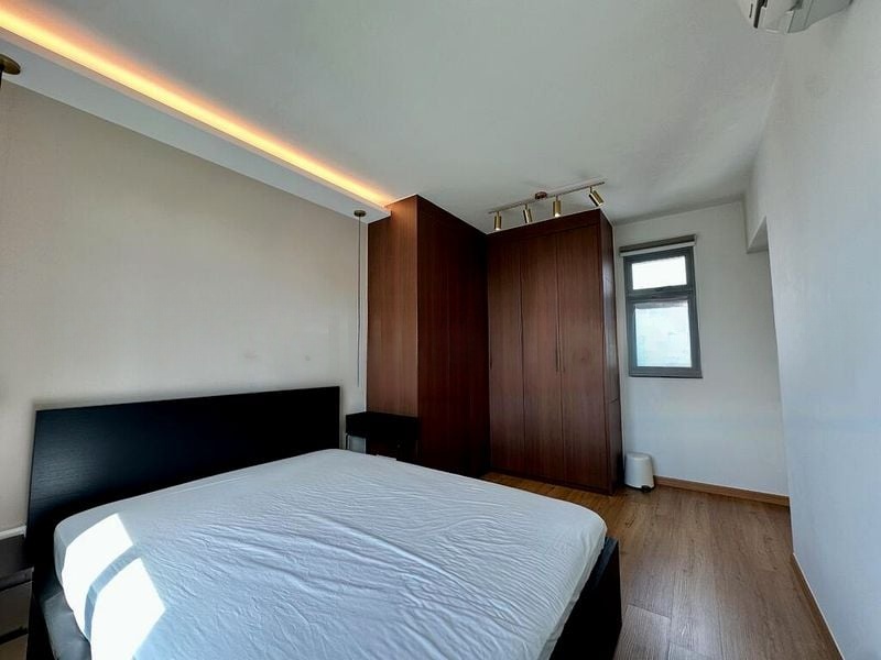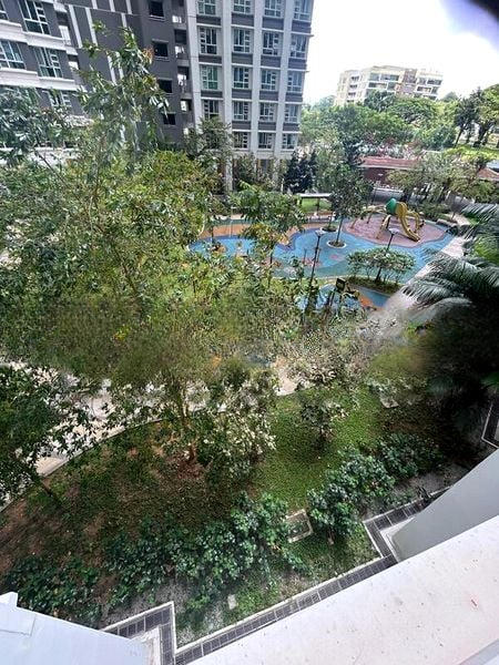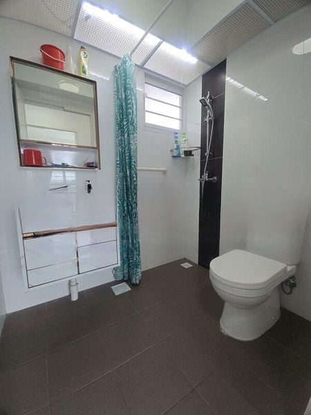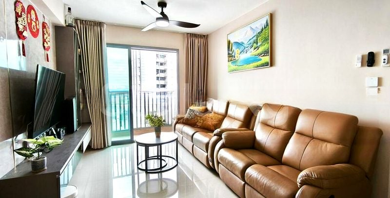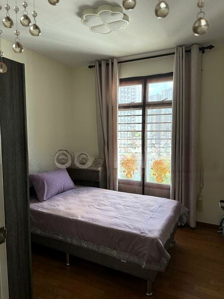 This well-maintained 4-room HDB unit features a practical layout with three spacious bedrooms, including a master bedroom equipped with a built-in white wardrobe and ceiling fan. The dining area boasts a stylish white table complemented by upholstered seating, ideal for family gatherings. With a dedicated service yard and household shelter, this home is designed for both comfort and functionality.