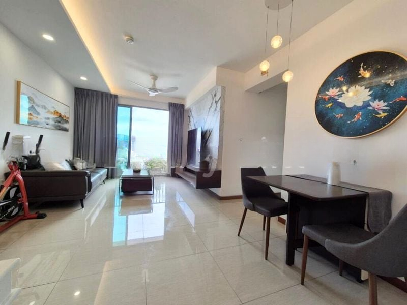 Step into a warm and inviting space where abundant natural light floods through large windows, illuminating the cozy living room adorned with landscape wall art and a tan leather sofa. The seamless flow to the balcony invites you to enjoy the tranquil views of greenery and the surrounding residential landscape, creating a perfect retreat from the bustling city.