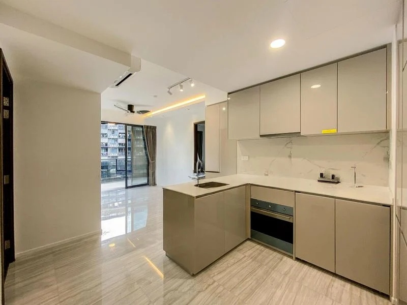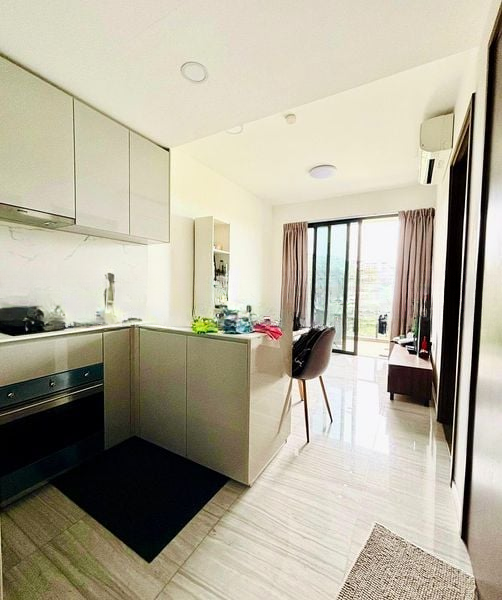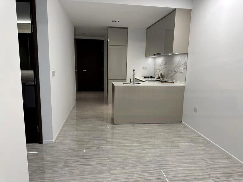 Step into a world of modern elegance as you enter this brand-new 1-bedroom unit at Parc Esta. The open-concept living and dining area, adorned with light-colored tiled flooring and white walls, creates a bright and airy ambiance, inviting natural light to dance across the space. The striking marble-patterned backsplash in the kitchen adds a touch of sophistication, while the sliding wooden door leads to a serene bedroom with a large window that frames the outside view beautifully.