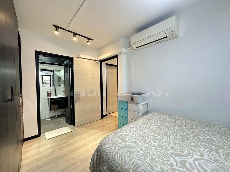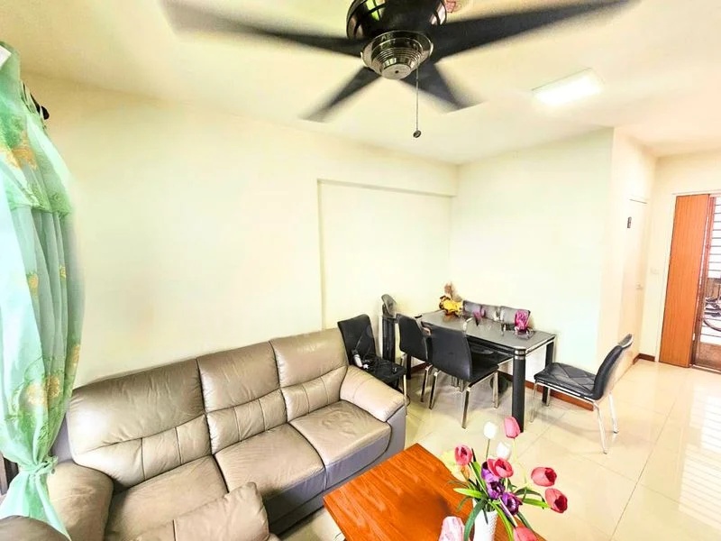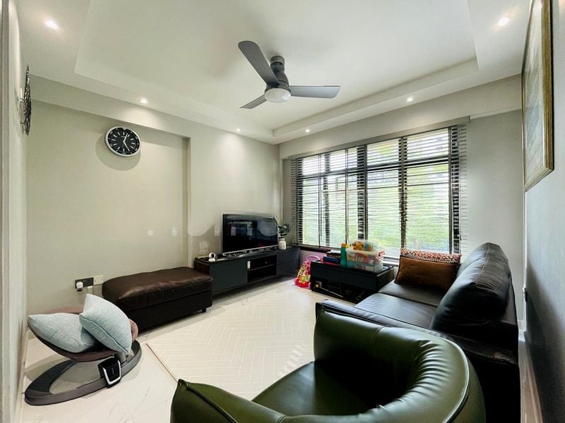 Step into a sanctuary of modern minimalist design at this well-maintained HDB flat. The moment you enter, you are greeted by an abundance of natural light filtering through the windows, illuminating the sleek finishes and creating an inviting ambiance. The false ceiling with recessed lighting and ceiling fans in every room enhance the contemporary feel, while the lush greenery views provide a serene backdrop.