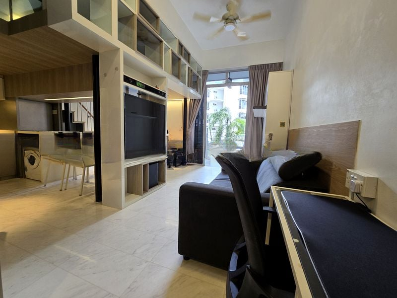 Step into a beautifully designed studio that exudes modern minimalist charm. The moment you enter, you are greeted by an inviting foyer featuring a custom shoe cabinet with integrated lighting, setting the tone for the rest of the unit. Natural light filters through the enclosed balcony, enhancing the spacious feel of the living area, which is adorned with a neutral sofa and a stylish built-in TV console.