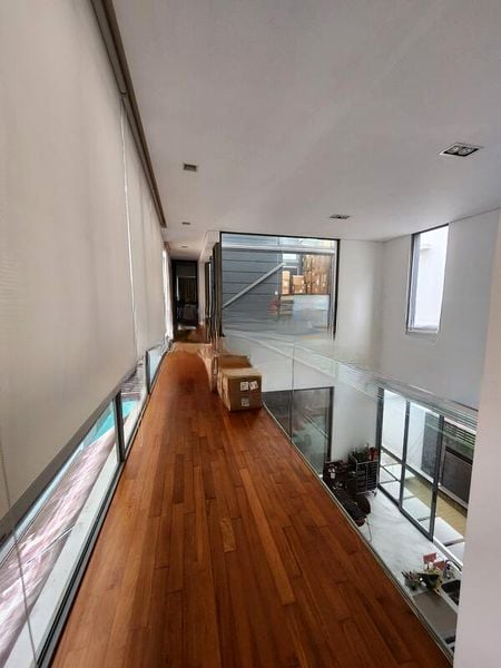 This stunning unit features five well-appointed bedrooms, each with large windows that invite in the light. The modern kitchen boasts sleek grey and white cabinetry, complemented by a double stainless steel sink and a large window. The luxurious bathrooms are fitted with rain showers and vessel sinks, showcasing dark grey accent tiles for a contemporary touch. A highlight of this property is the expansive roof terrace, ideal for entertaining or enjoying serene evenings under the stars.