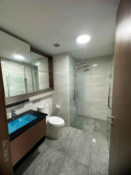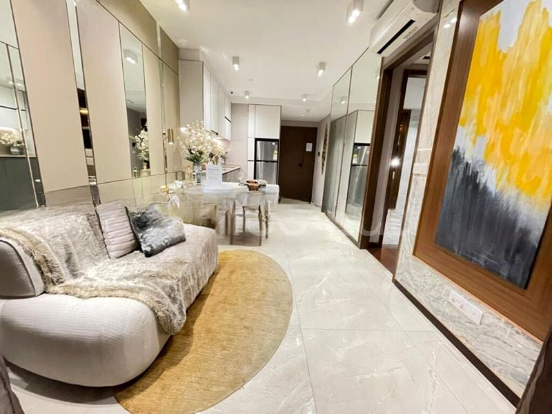 This efficient 49 sqm layout features a seamless flow between the living and dining areas, complemented by a compact yet modern kitchen equipped with integrated appliances. The master bedroom boasts luxurious wood flooring, a padded headboard, and floor-to-ceiling curtains, ensuring a restful retreat. The bathroom is a masterpiece of design with its glass swing door shower and elegant marble-look wall tiles, providing a spa-like experience at home.