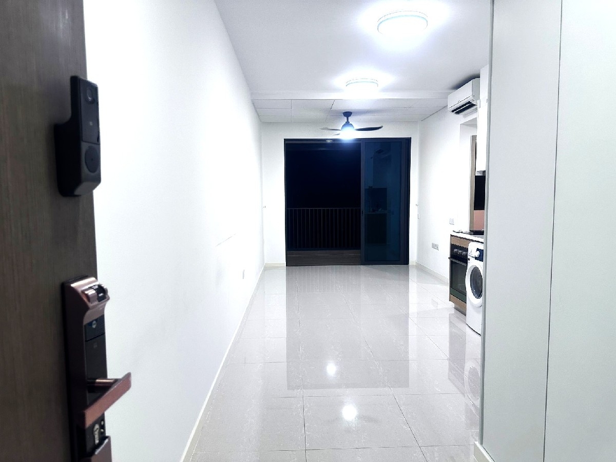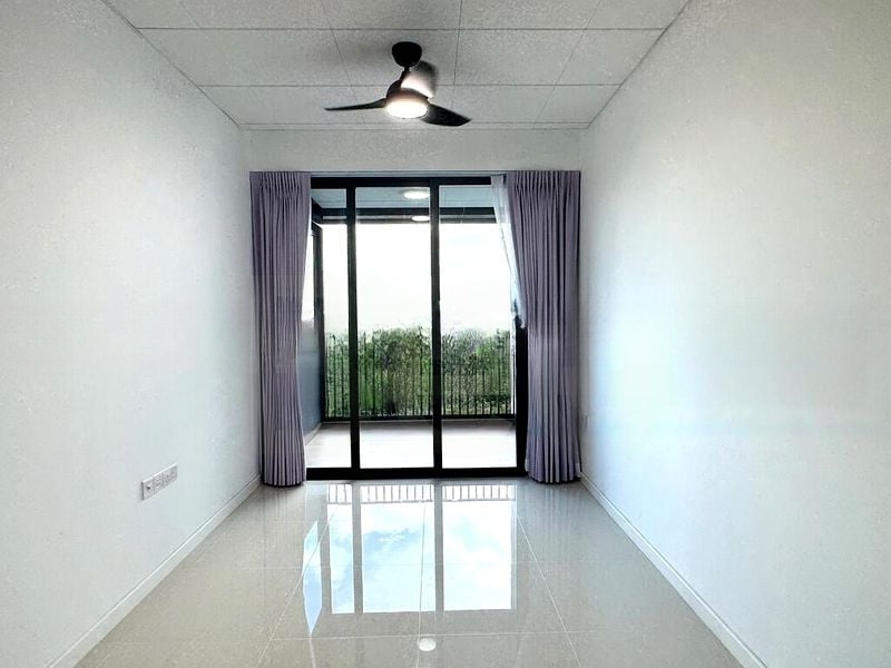 Step into a serene oasis at Treasure at Tampines, where modern minimalist design meets natural tranquility. The unfurnished unit greets you with an abundance of natural light filtering through full-height curtains, illuminating the sleek white walls and wood-look flooring. Enjoy views of lush greenery that create a peaceful ambiance, perfect for relaxation after a long day.