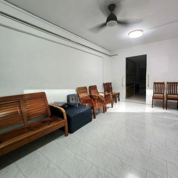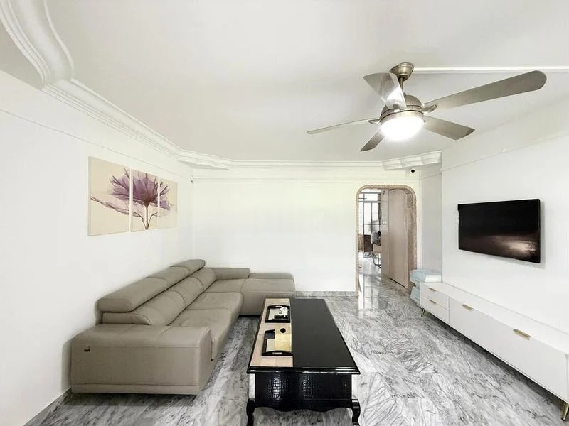 Step into a bright and airy sanctuary at 177 Ang Mo Kio Ave 4, where the elegant marble-patterned floor tiles and decorative false ceiling with cove lighting create an inviting ambiance. The living room, adorned with an L-shaped leather sofa and a wall-mounted TV, seamlessly connects to the lush greenery outside through arched doorways, enhancing the sense of space and tranquility.