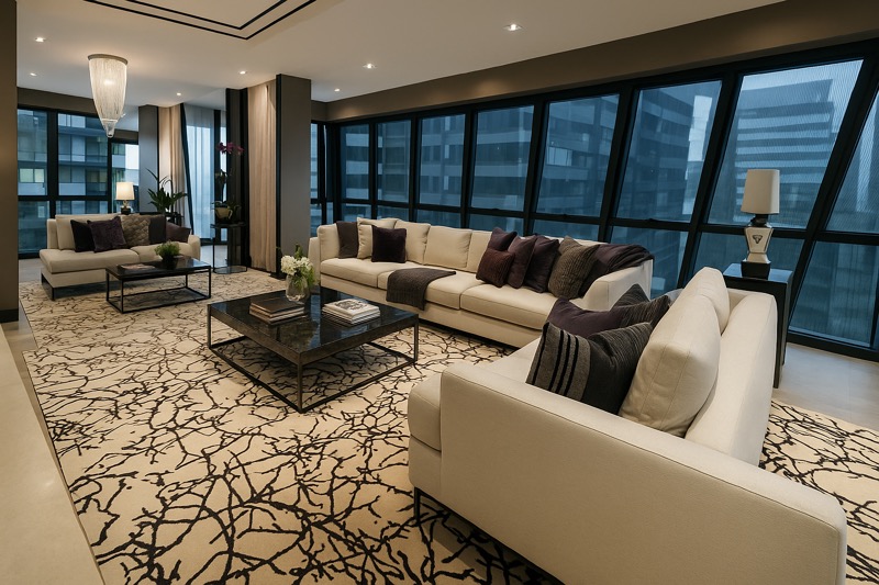 This well-maintained unit features four spacious bedrooms, each thoughtfully designed with unique elements such as integrated window seats and pop-art wall decor. The dining room boasts a large dark wood table, perfect for entertaining, while the gallery-style hallway leads to a striking staircase with glass balustrades and a double-volume ceiling. Every corner of this home reflects meticulous attention to detail and high-end finishes.