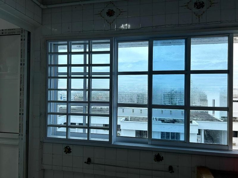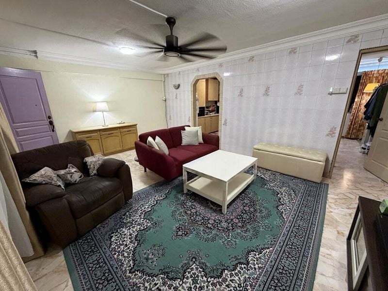 Step into a warm and inviting atmosphere as you enter this well-maintained 2-bedroom HDB flat. The cozy ambiance is enhanced by moderate natural light filtering through the sliding glass door, illuminating the industrial pendant light in the dining area and the stylish wood-look flooring. Enjoy the comfort of a rain shower in the modern bathroom, complemented by sleek white fixtures and dark floor tiles.
