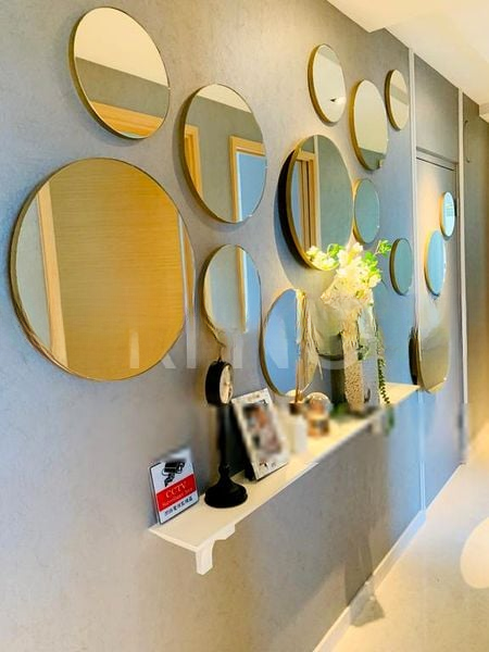 Step into a bright and airy sanctuary where abundant natural light dances through floor-to-ceiling windows, framing stunning city skyline and greenery views. The designer finishes, highlighted by a striking chandelier and a circular mirror wall feature, create an inviting ambiance that instantly captivates.