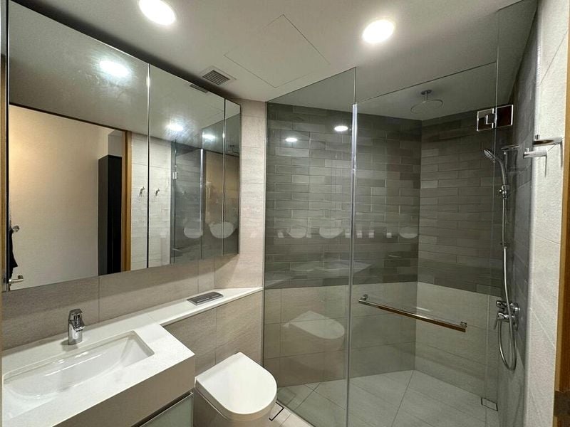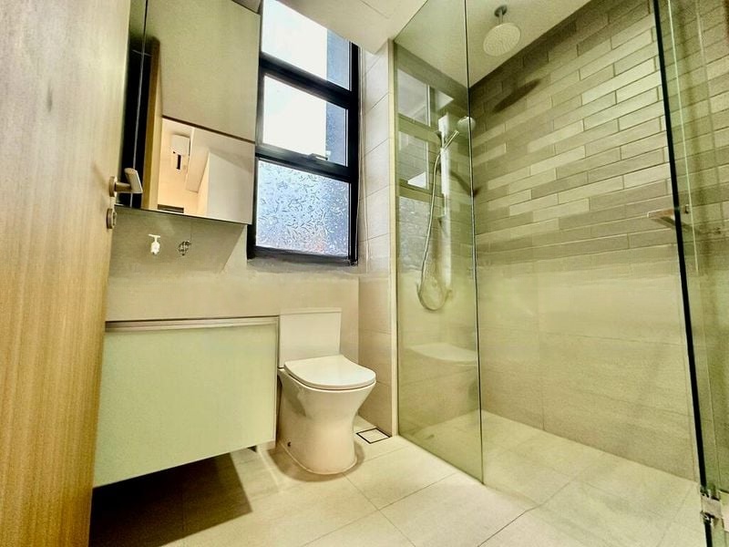 This well-maintained 1-bedroom unit features an open-concept kitchen with dark minimalist cabinetry, seamlessly flowing into the living area. The bathroom boasts a glass-enclosed shower with a rain shower head, while the bedroom offers warm wood-look parquet flooring and floor-to-ceiling built-in wardrobes for ample storage. Every detail has been thoughtfully curated to provide a stylish and functional living experience.