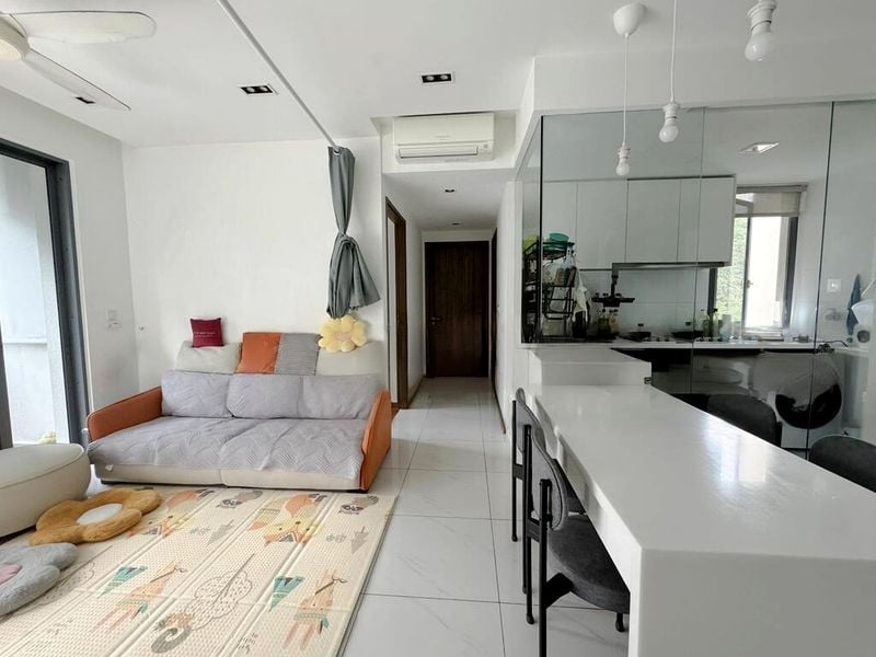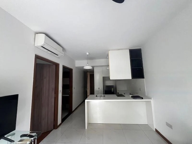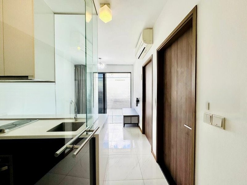 This well-maintained unit features a glass-enclosed kitchen with sleek white quartz countertops and integrated appliances, including a double-door refrigerator and induction hob. The bedroom boasts dark wood flooring and a built-in sliding wardrobe, while the bathroom impresses with its modern black marble-look tiles and a luxurious glass shower enclosure. Every detail has been thoughtfully designed for comfort and style.