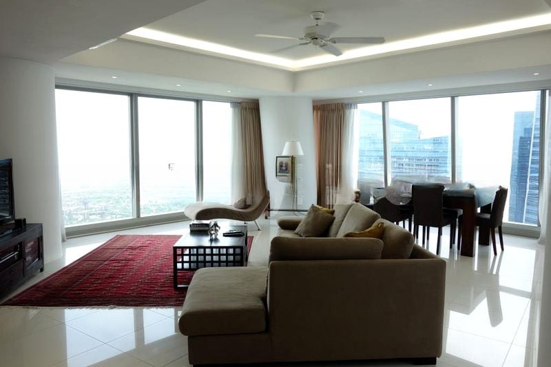 Step into a world of modern elegance at Marina Bay Residences, where the stunning panoramic views of the city skyline and Marina Bay greet you as you enter. The open-concept living area is bathed in natural light, showcasing polished tile flooring and designer pendant lighting that enhances the minimalist ambiance. Large-scale abstract wall art adds a touch of sophistication, creating a space that feels both inviting and luxurious.