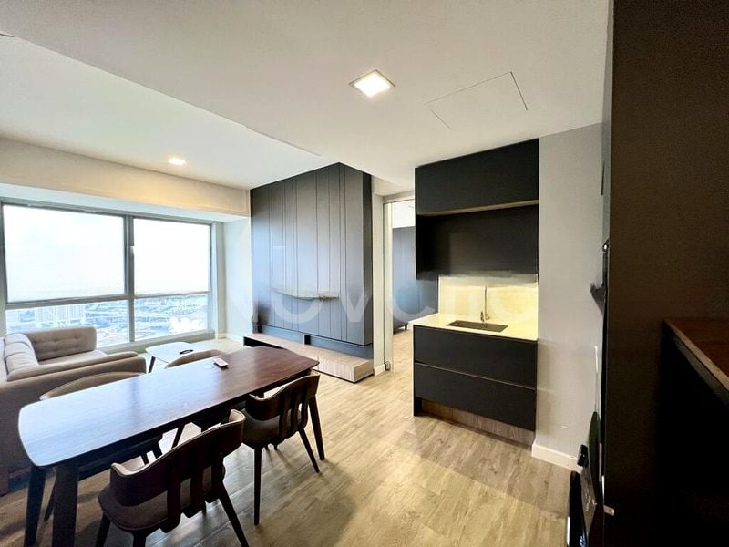 Step into a world of modern elegance at Marina Bay Residences, where the stunning panoramic views of the city skyline and Marina Bay greet you as you enter. The open-concept living area is bathed in natural light, showcasing polished tile flooring and designer pendant lighting that enhances the minimalist ambiance. Large-scale abstract wall art adds a touch of sophistication, creating a space that feels both inviting and luxurious.