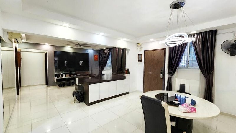 Step into a beautifully renovated HDB flat that exudes modern minimalist charm. The moment you enter, you are greeted by an inviting ambiance, accentuated by designer pendant lighting and a custom black and white TV console. The polished tile flooring reflects natural light, creating a warm and welcoming atmosphere, while the urban views from the living room add a vibrant touch to your living experience.