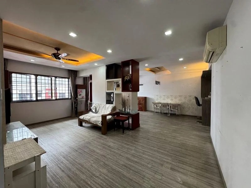 The thoughtful layout features a spacious living area with a false ceiling and recessed lighting, perfect for entertaining. The living room boasts a floral upholstery sofa, complemented by a large wooden display cabinet. Each bedroom is equipped with ceiling fans and air-conditioning for comfort, while the study provides a quiet nook for work or reading. The bathroom showcases white tiled walls and practical corner shelving, ensuring functionality meets style.