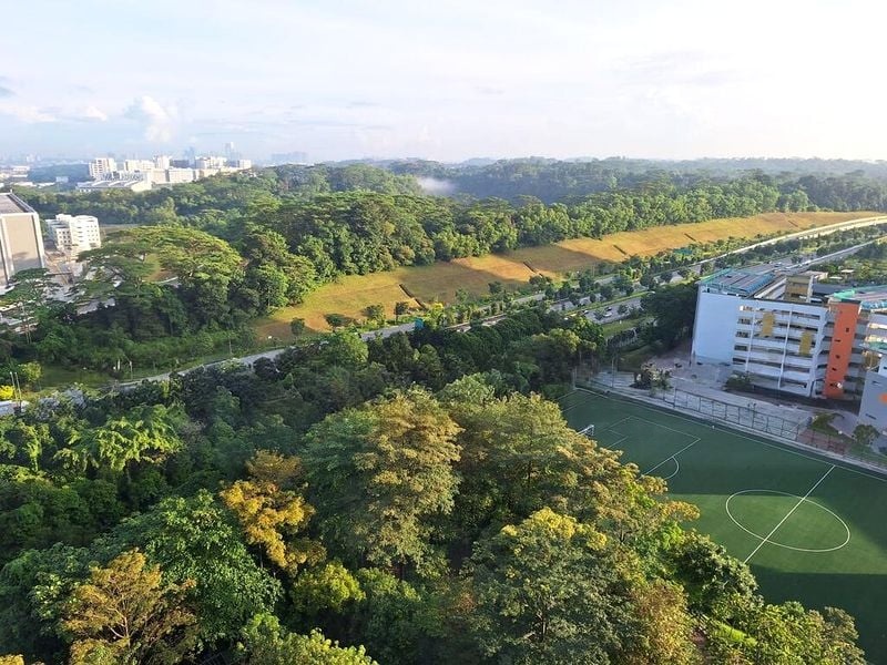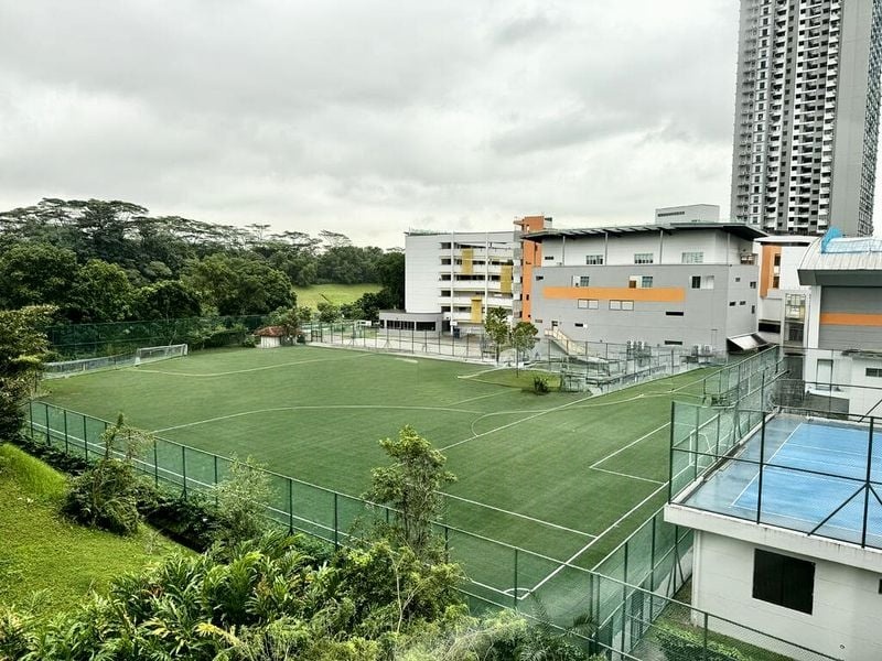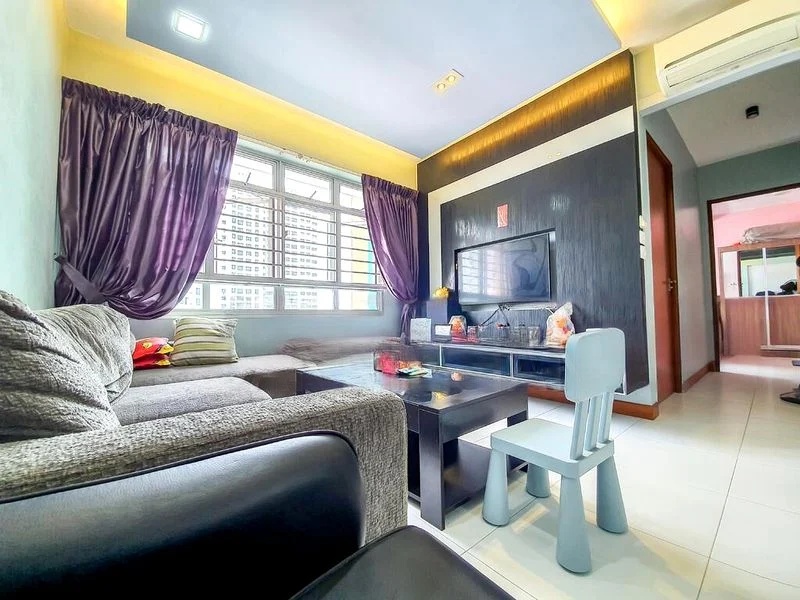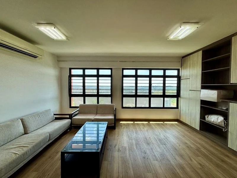 Step into this well-maintained 4-room flat and be greeted by a warm ambiance, highlighted by a functional layout and moderate natural light filtering through large windows. The living room, adorned with a dark brown leather sofa and a ceiling fan with integrated lighting, invites relaxation while offering views of the surrounding greenery and neighboring buildings.