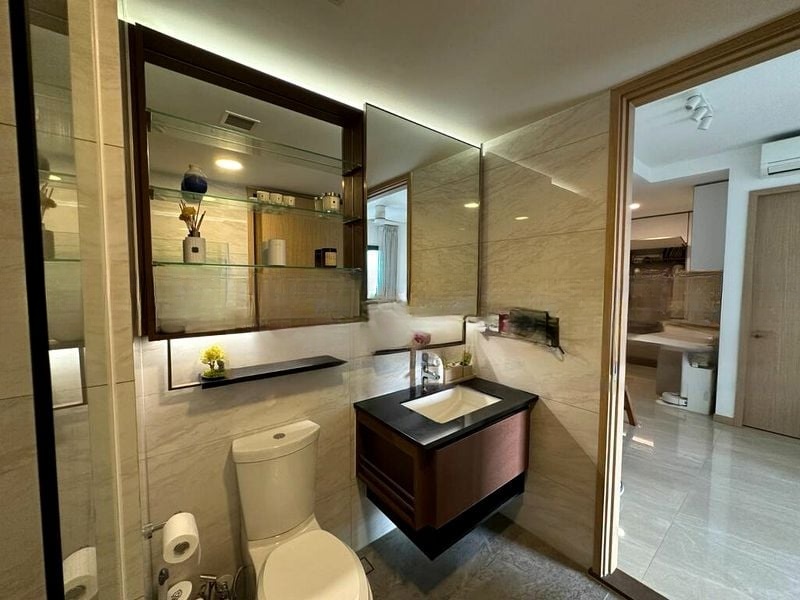 The unit features a well-appointed kitchen with a linear layout, equipped with an induction hob, built-in oven, and under-cabinet LED lighting that enhances the sleek two-tone cabinetry. The en-suite bathroom boasts a rain shower, glass shower partition, and elegant grey marble-look tiles, while the balcony with artificial turf flooring offers a perfect spot to unwind and take in the panoramic views.