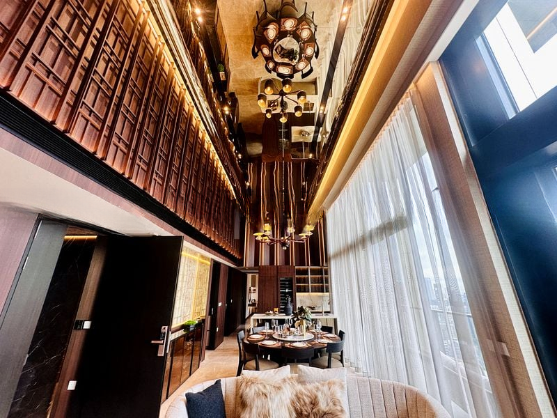Step into a world of sophistication as you enter this brand-new designer unit at Irwell Hill Residences. The abundant natural light floods through the floor-to-ceiling windows, illuminating the double-volume living space adorned with a stunning mirrored ceiling and elegant designer chandeliers. The plush curved sofa and exquisite marble dining table invite you to relax and entertain while enjoying breathtaking views of the city skyline, pool, and landscaped gardens.