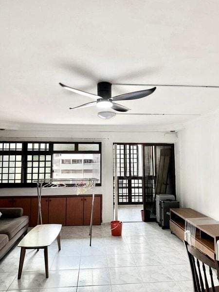Step into a functional and lived-in space, where the open-plan living and dining areas are accentuated by a stylish false ceiling with cove lighting, creating a warm ambiance. The moderate natural light filters through the windows, offering a glimpse of the neighboring buildings while maintaining a cozy atmosphere.