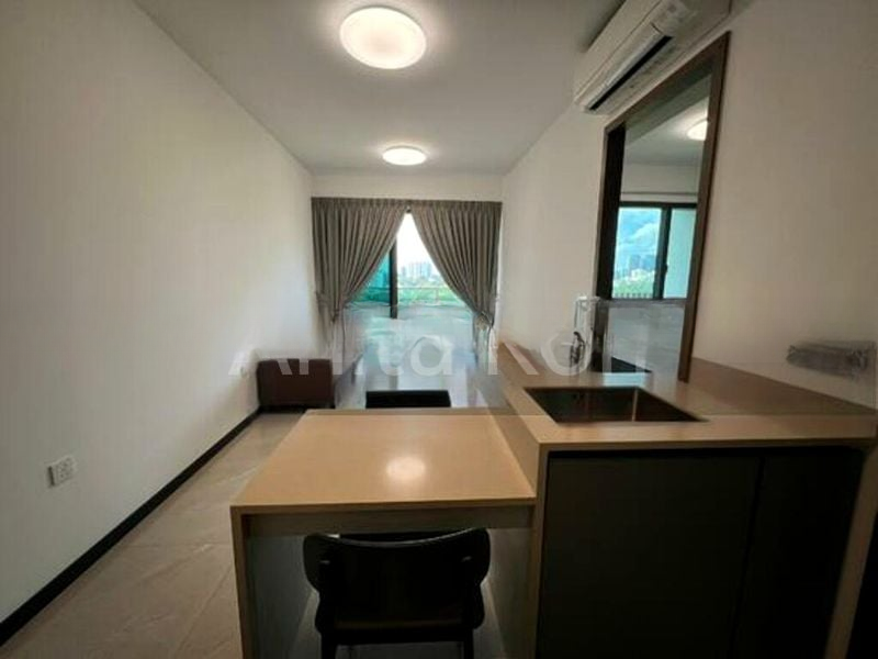 This thoughtfully designed unit features polished tile flooring in the living room, seamlessly connecting to the balcony through sliding glass doors. The bedroom boasts wood-look laminate flooring and a built-in sliding door wardrobe with a sleek metallic finish, enhancing the modern aesthetic. With split-unit air conditioning throughout, comfort is guaranteed in every corner of this home.