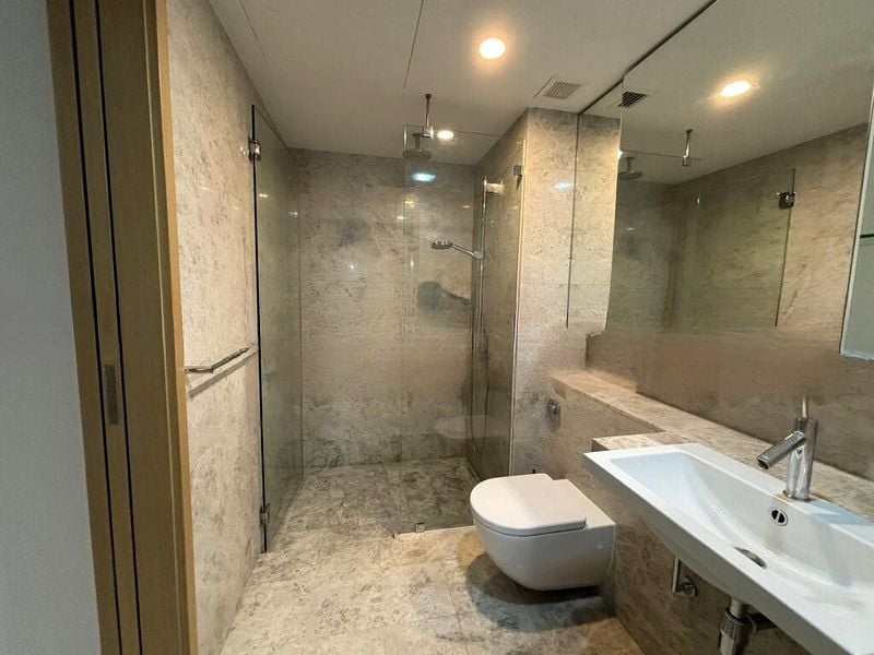 This well-maintained 1-bedroom unit features standout elements such as a marble-clad bathroom with a luxurious rain shower, and a galley kitchen equipped with integrated appliances and a glass viewing panel that connects to the living area. The minimalist aesthetic continues into the bedroom, where a sliding glass door partition enhances the sense of space and light, creating a serene retreat.