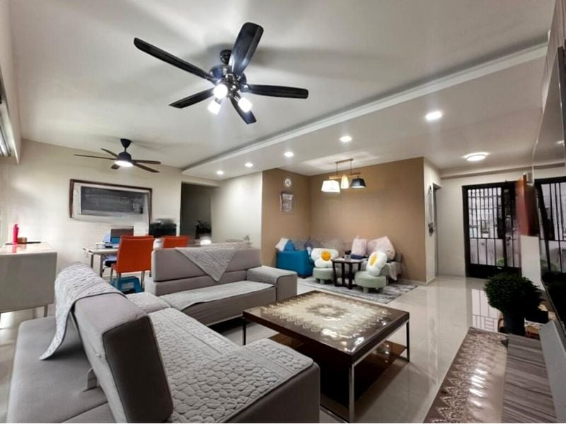 Step into a warm and inviting atmosphere in this beautifully renovated 5-room corner unit at 315B Yishun Ave 9. The open concept living area is bathed in natural light, showcasing polished floor tiles and a stunning TV feature wall with integrated shelving. The cozy L-shaped sofa invites relaxation, while the false ceiling with cove lighting adds a touch of elegance to the space.