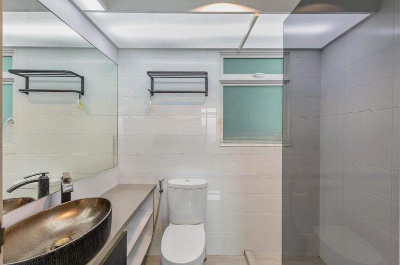 This well-maintained, fully-furnished unit features three thoughtfully designed bedrooms, including a master suite with a luxurious vessel sink and a striking black-framed glass shower cubicle. The living room boasts a ceiling fan and tiled flooring, while the study offers a dual workstation desk and floor-to-ceiling bookshelves, perfect for productivity or relaxation. Each room is adorned with built-in wardrobes featuring gold accents, adding a touch of sophistication.