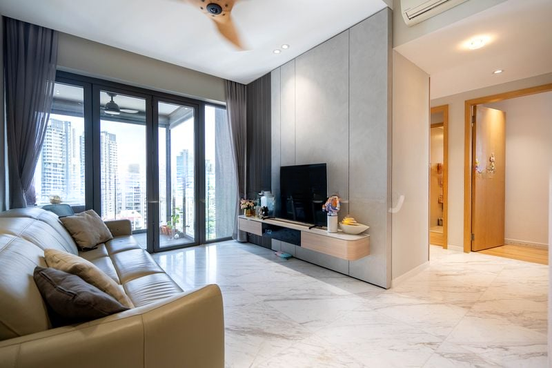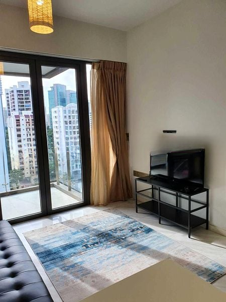 Step into a sanctuary of modern minimalism, where the sleek marble-look floor tiles reflect a sense of elegance throughout the open-plan living area. Large windows invite natural light, creating a bright yet intimate ambiance, while the sliding glass doors lead to a balcony that offers stunning night views of the city skyline.