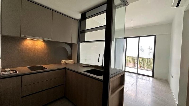 Step into a world of elegance as you enter this brand-new unit at KI Residences at Brookvale. The abundant natural light floods through the floor-to-ceiling windows, creating a bright and airy ambiance that perfectly complements the stunning panoramic views of the city skyline and lush greenery. Polished tile flooring in the living room leads seamlessly to a private balcony, inviting you to unwind while soaking in the breathtaking scenery.