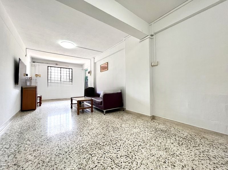 Step into a world of traditional charm with this high-floor HDB unit, where the original finishes evoke a sense of nostalgia. The spacious living room, adorned with classic tiled flooring and a round ceiling light, invites you to relax and enjoy the moderate natural light streaming in. From the balcony, relish the unblocked views of the cityscape and surrounding greenery, creating a serene backdrop for your daily life.