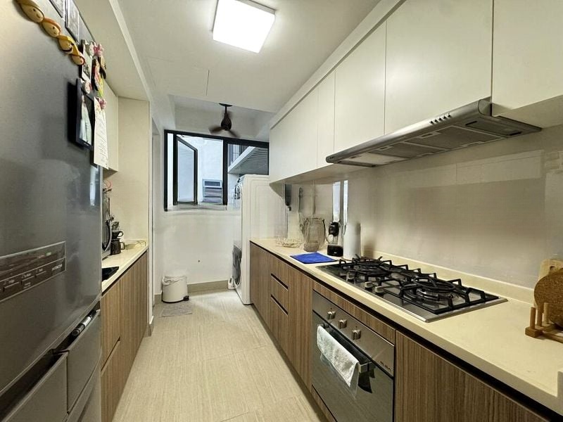 This well-maintained 3-bedroom unit features standout rooms, including a master bedroom with a textured feature wall and built-in sliding wardrobe, ensuring both style and functionality. The common bedroom is designed for versatility, with an integrated platform bed and study desk, while the dedicated study room boasts a long built-in wooden desk and custom overhead shelving, perfect for productivity. Each space has been thoughtfully curated to maximize comfort and efficiency.