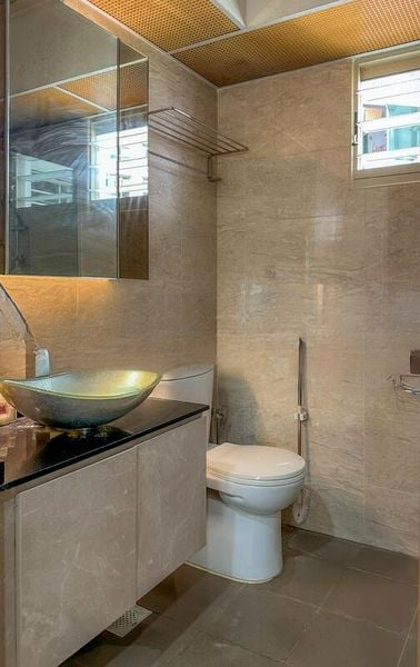 Step into a beautifully renovated 3-bedroom flat that exudes modern elegance and functionality. The well-maintained interiors are bathed in natural light, highlighting the custom platform beds and integrated storage solutions. The designer pink and white striped wardrobe panels add a playful yet chic touch, while the blue accent wall in the first bedroom creates a calming atmosphere.