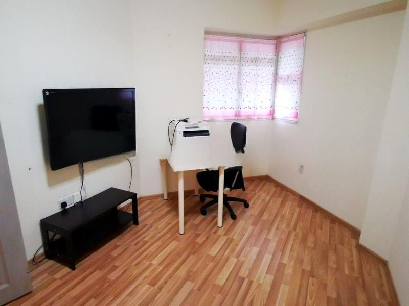 This well-maintained 3-bedroom unit features an open-concept layout that seamlessly connects the dining area and kitchen, equipped with elegant black marble-look countertops and patterned upper cabinets. Each room is thoughtfully designed, from the air-conditioned bedroom with a tufted headboard to the study room adorned with textured brick-effect wallpaper, ensuring a perfect balance of functionality and aesthetics.