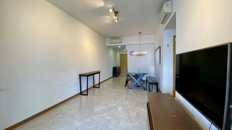 Step into this beautifully renovated unit at Cityscape @Farrer Park, where modern minimalism meets urban living. The marble-look floor tiles glisten under the natural light, creating a warm and inviting ambiance. Enjoy the seamless flow from the living room to the balcony, where wood-look tiles and glass railings offer a perfect spot to unwind while taking in the views of neighboring buildings.
