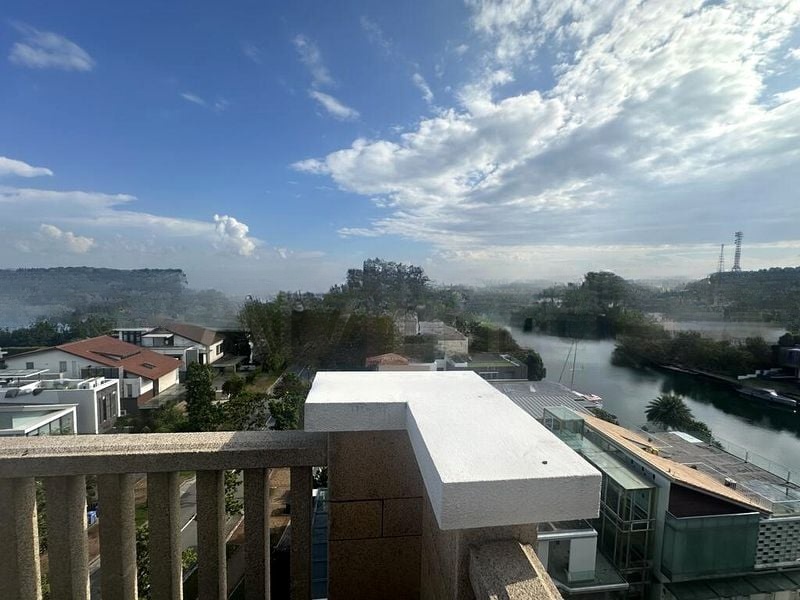Step into a world of modern luxury where abundant natural light floods through floor-to-ceiling glass walls, framing breathtaking views of greenery and the shimmering waters of the port. The ambiance is a perfect blend of minimalist design and sophistication, enhanced by polished stone flooring and dark marble accents that create a serene yet striking atmosphere.
