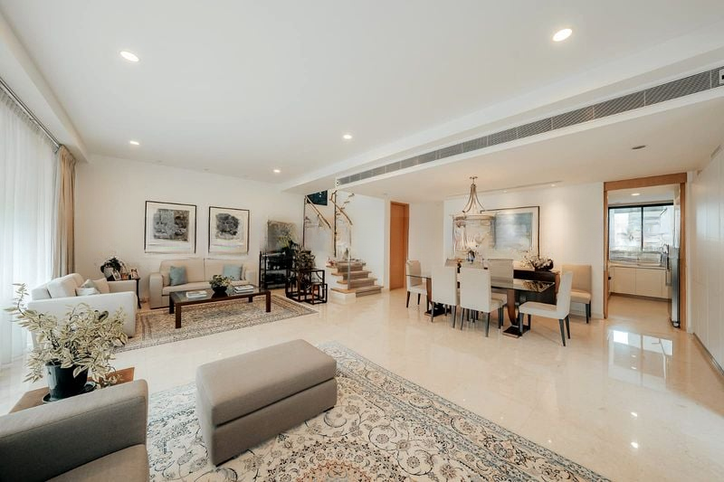This well-maintained 4-bedroom, 4-bathroom unit boasts a spacious layout, featuring a contemporary living room with a grey L-shaped sofa and direct access to a large balcony adorned with artificial turf. The dining area is perfect for entertaining, showcasing a solid wood dining table and an art display wall that adds a touch of elegance. Enjoy the serene outdoor space with pool views, complemented by a tranquil water feature and tropical landscaping.