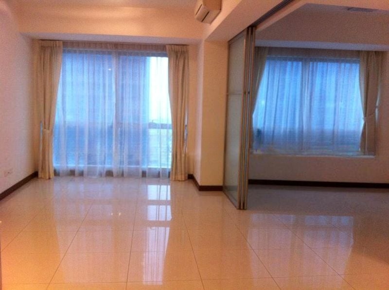 Step into a bright and airy sanctuary where floor-to-ceiling windows frame stunning panoramic views of the city skyline and the sea. The abundant natural light floods the space, enhancing the elegant dark wood parquet flooring that runs throughout the unit, creating a warm and inviting ambiance.