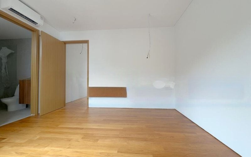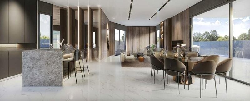 This stunning unit features an open-plan layout that seamlessly connects the living, dining, and kitchen areas. The spacious living room boasts a large L-shaped sofa, while the dining area is perfect for entertaining with direct access to the outdoor space through glass sliders. The kitchen is a chef's dream, featuring a marble waterfall island and minimalist dark cabinetry. Retreat to the master bedroom, where you’ll find a walk-in wardrobe with glass doors and designer pendant lighting, creating a tranquil haven.