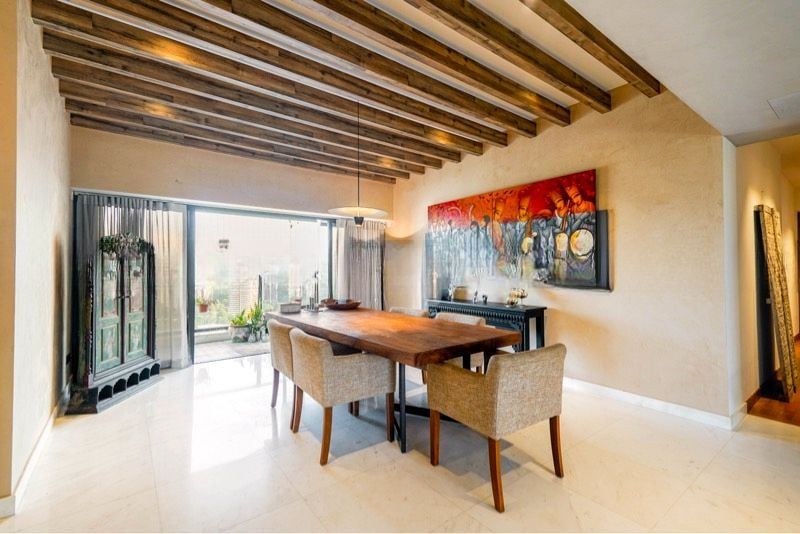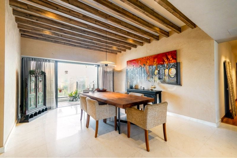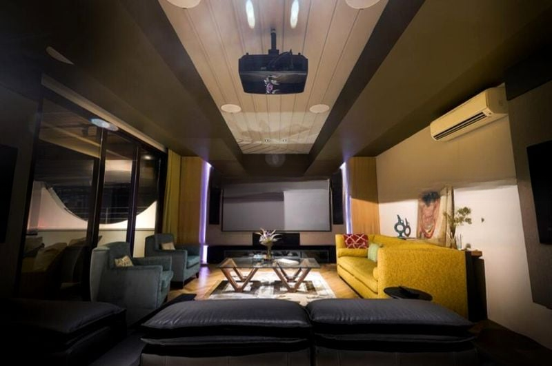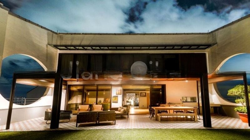 This well-maintained 5-bedroom unit boasts standout features including a home theater with a ceiling-mounted projector, a large private terrace adorned with patterned floor tiles and artificial turf, and a sleek kitchen island with bar seating. Each room is thoughtfully designed, from the study/music area with integrated piano nook to the luxurious master bedroom featuring built-in dark wood shelving and a green fabric headboard wall. The integration of modern art displays and warm accent lighting enhances the overall aesthetic, making this home a true masterpiece.
