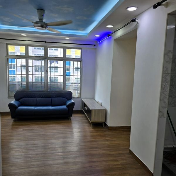 Step into this beautifully renovated 4-bedroom HDB flat and be greeted by a warm, inviting atmosphere. The open-concept living room features polished tile flooring and is bathed in natural light, thanks to the folding glass doors that seamlessly connect to the enclosed balcony, offering an urban view that inspires creativity.