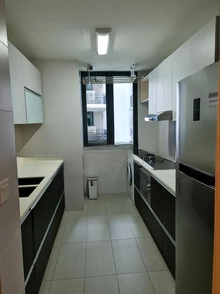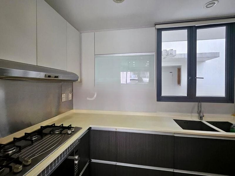 This well-maintained 2-bedroom, 2-bathroom unit boasts standout features including a fully-equipped kitchen with marble-patterned cabinetry and built-in oven, a master bedroom with a textured accent wall and large window, and a second bedroom featuring a clever bunk bed with storage stairs. The bathrooms are designed with sophistication, featuring dark mosaic tiles and vessel sinks that elevate your daily routine.