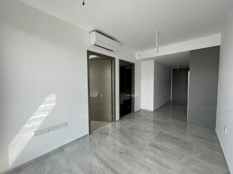 This efficient 1-bedroom plus study layout spans 614 sqft, featuring a dedicated study room that adds versatility to your living space. The kitchen boasts a linear layout with a stylish marble-look backsplash and integrated Bosch appliances, while the master bedroom is equipped with a built-in sliding wardrobe and large windows for ample light. The bathroom showcases modern finishes, including grey stone-look tiles and a glass shower partition, enhancing the overall contemporary feel of the home.