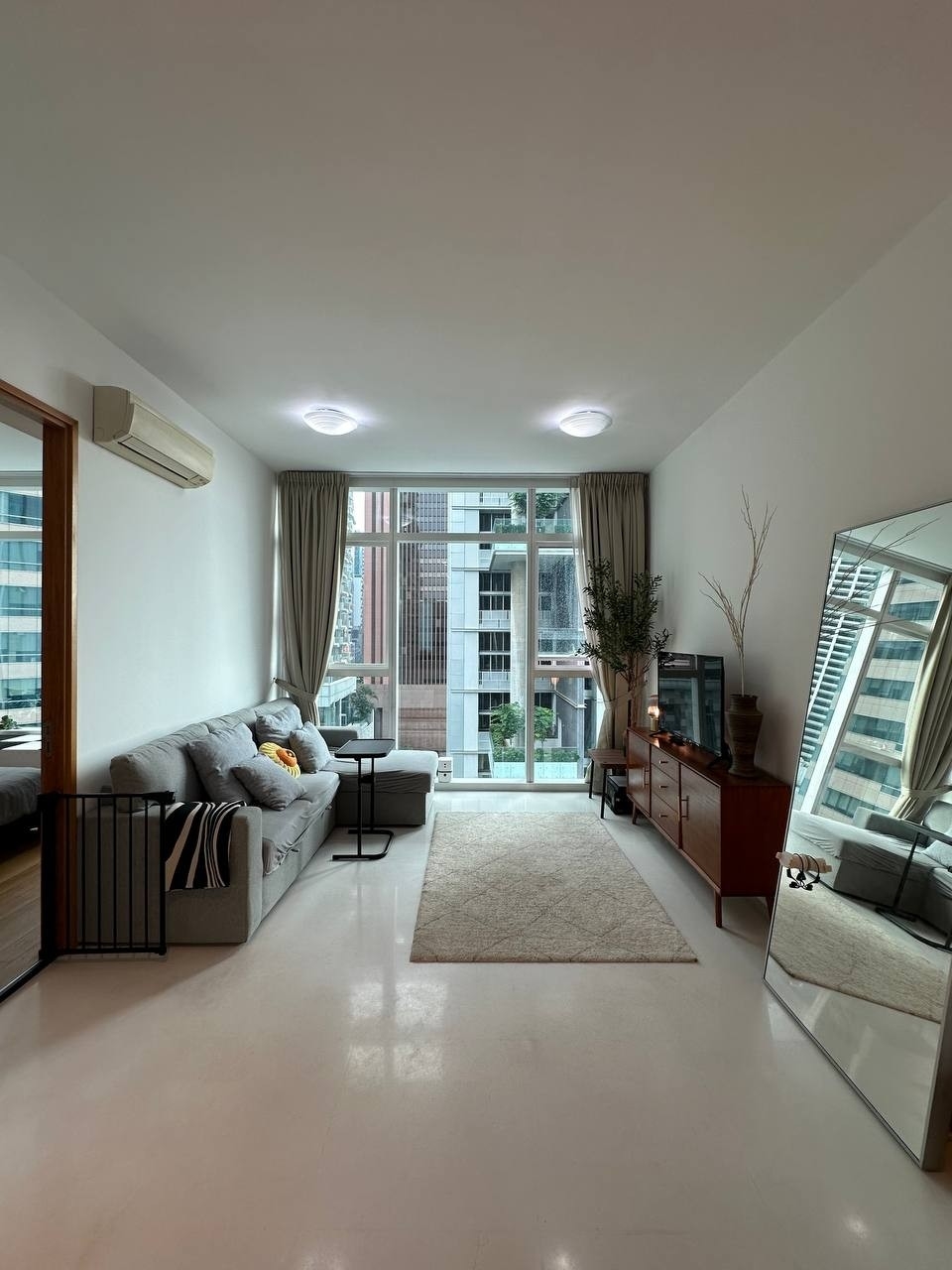 Step into a beautifully renovated sanctuary where modern minimalism meets urban elegance. The open-concept living and dining area, adorned with polished white floor tiles and a striking copper-toned pendant light, invites natural light to dance across the space. Large windows frame captivating city views, creating an ambiance that is both stylish and serene.